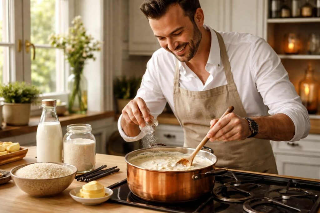 La cuisson doit être bien contrôlée. Pour transformer le mélange de lait et de crème en véritable crème pâtissière de riz, assurez-vous de surveiller la température. Une cuisson à feu doux est la clé pour obtenir un mélange fondant et onctueux. En cas de problèmes d’accroche, le chef recommande parfois même de remuer délicatement la préparation pour libérer les grains qui auraient pu s’installer au fond.